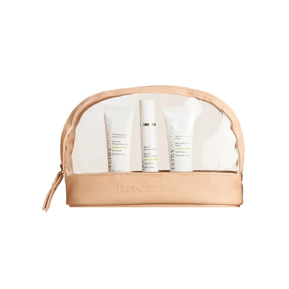 A travel-friendly starter kit featuring Ultraceuticals’ best-sellers: foaming cleanser, B² hydrating serum, moisturiser, and SPF 50. Includes reusable pads and a compact bag. Perfect for trial, travel, or gifting.